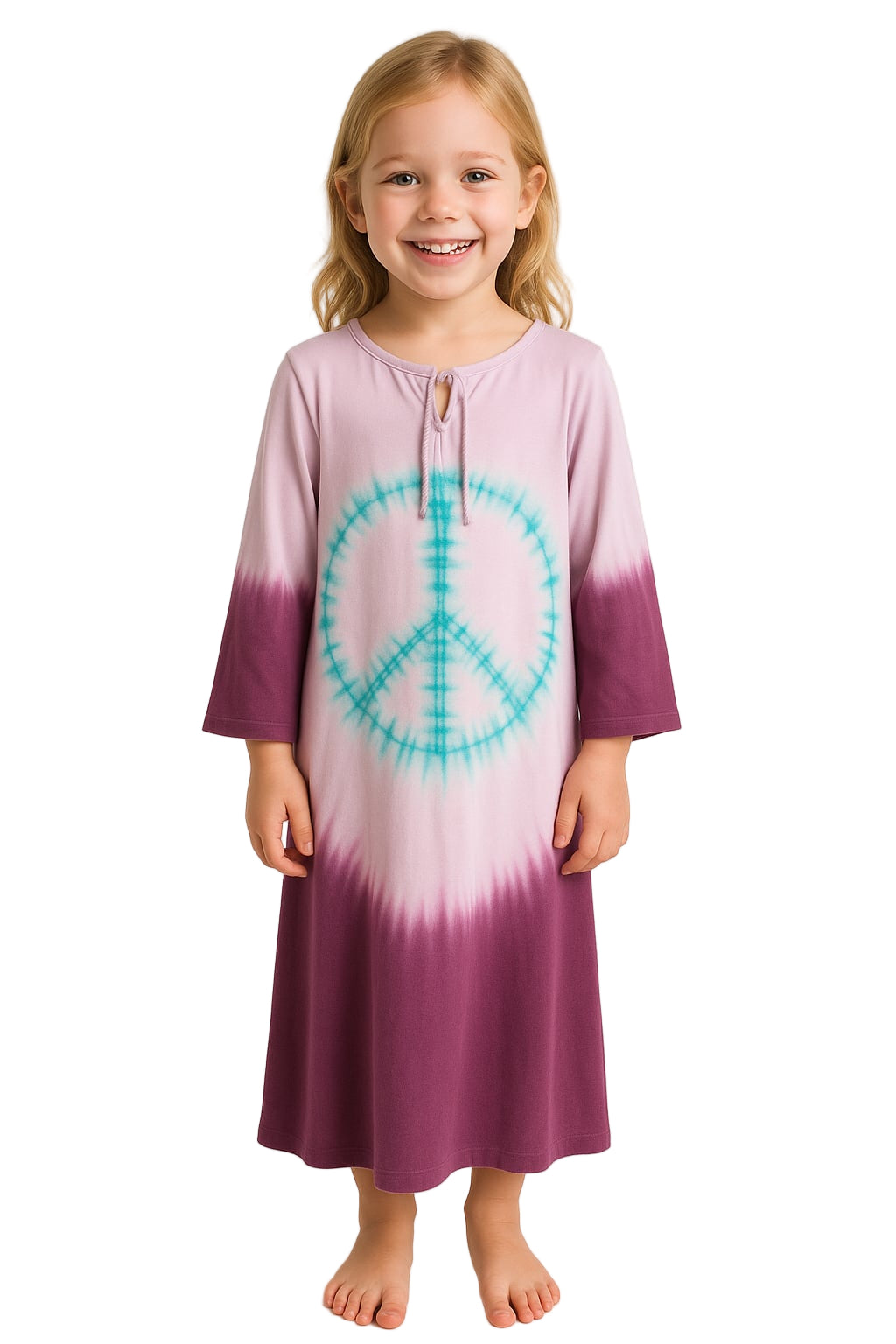 Plonge dans l’ambiance bohème et joyeuse avec cette robe tie-dye longue manches évasées ! Son motif Peace and Love bleu turquoise au centre et son dégradé violet-rose lui donnent un style unique, parfait pour les journées d’été, les vacances ou les moments cocooning à la maison. Légère, fluide et confortable, elle convient aussi bien pour les enfants que pour les jeunes filles au look libre et coloré.